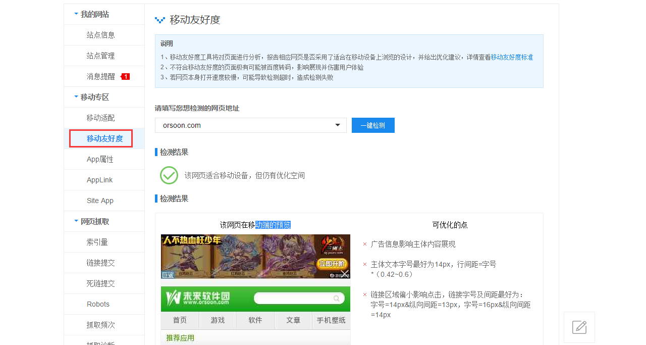 如果上面幾點站長對于自己網(wǎng)站調(diào)整還無從下手的話,可以通過站長工具里面的移動友好度進行評測,根據(jù)評測結(jié)果進行網(wǎng)站調(diào)整。