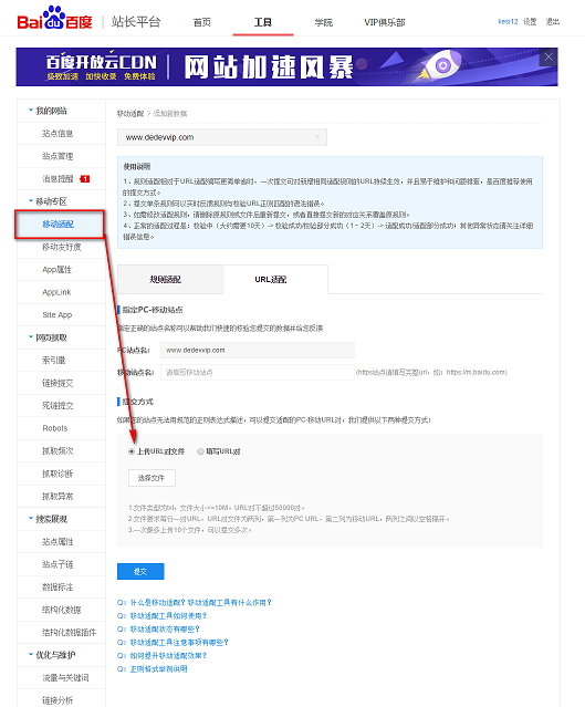 這一點我認為尤其重要,因為在早期很多網(wǎng)站沒有移動化站點,也并沒有做自適應(yīng)的處理,這樣就導(dǎo)致m.baidu.com在收錄時,是被百度收錄了的PC頁面或者被百度轉(zhuǎn)碼,所以我們在做了移動站點后第一件要做的事情就是做好適配,這里站長學(xué)院介紹了三種適配的方式(參考鏈接:http://zhanzhang.baidu.com/college/courseinfo?id=156),在做完網(wǎng)站的適配之后,站長也可以將pc站和移動站一一對應(yīng)的關(guān)系在百度站長平臺后臺進行提交。