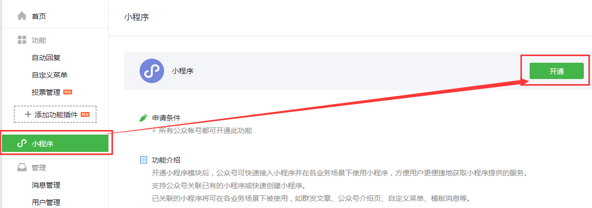 (1.2)若顯示已認證,請點擊公眾號左側(cè)導(dǎo)航——小程序——開通