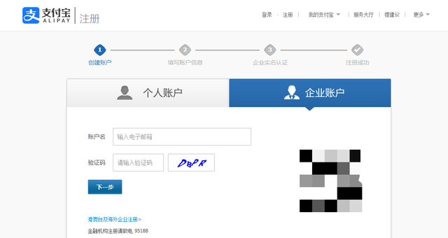 (6)進入到支付寶的注冊頁面,填寫信息,完成后點擊下一步。