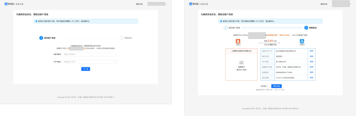 使用企業(yè)名下的對公銀行賬戶,通過網(wǎng)銀轉(zhuǎn)賬驗證(需與主體證照的名稱一致)。