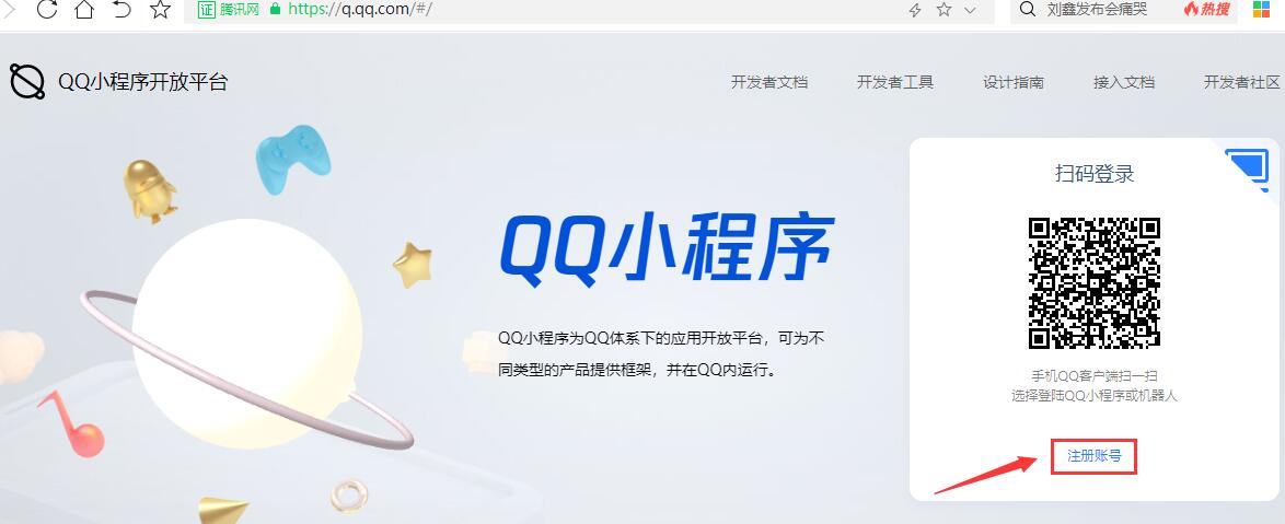 (1)登錄QQ小程序官網(wǎng) https://q.qq.com/#/ 點擊“注冊帳號”,進行帳號注冊。