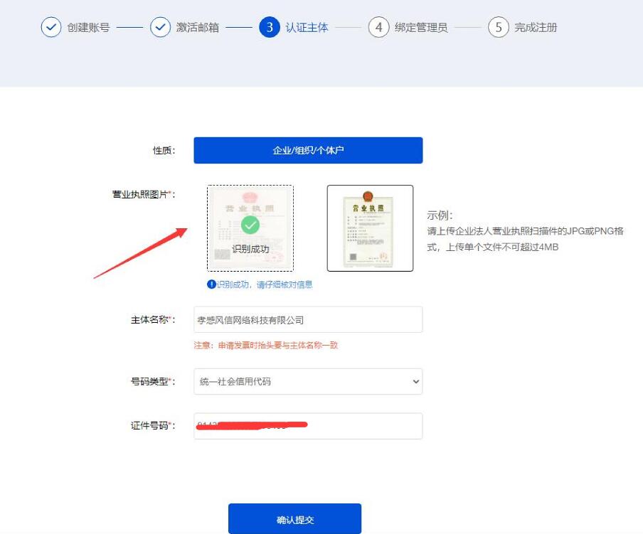 我們以企業(yè)類型作為主體進行下面的操作,按照提示,上傳營業(yè)執(zhí)照圖片,填寫主體名稱、統(tǒng)一社會信用社代碼,然后點擊確認提交。