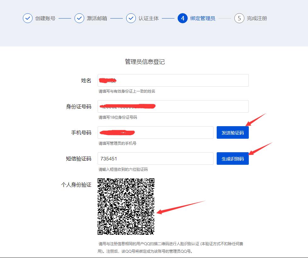 管理員信息登記包括:姓名、身份證號碼、手機號碼驗證、個人身份證驗證