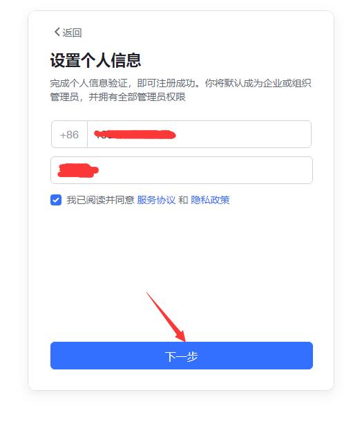 自動進入“設(shè)置個人信息”界面,填寫手機號、姓名,勾選服務(wù)協(xié)議,點下一步。